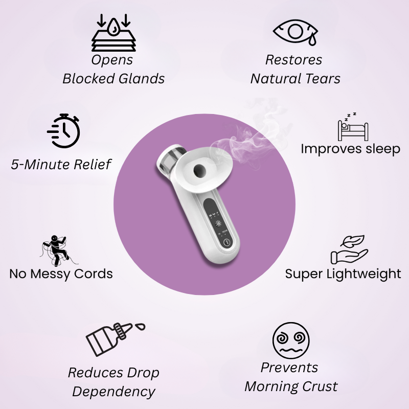 When blocked glands receive gentle heat, trapped oils melt and flow naturally again. This restores your tear film's protective layer, keeping moisture on your eyes for hours instead of seconds. With regular warming, your glands stay open and functional - allowing your eyes to maintain their own moisture throughout the day.